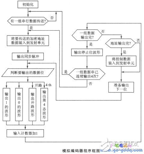 Each set of serial data output waveforms from the VD5026-4 includes a synchronization pulse, a 12-bit encrypted address and control data, and a single stop bit. The pulse sequence is arranged in the order of AO to A7, followed by A8/DO to All/D3. Each group of serial data is transmitted at least four times to ensure reliability. Once the serial data format, verification method, pulse period, duty cycle, and their corresponding relationships are understood, the application program can be developed according to the encoding pulse output requirements, enabling the microcontroller to perform the encoder's functions. The block diagram of the analog encoder is illustrated below.