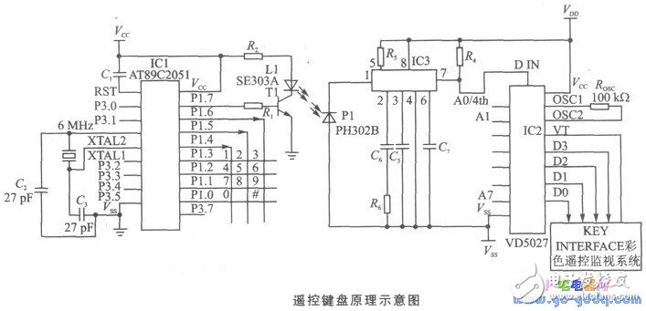 The infrared remote control keyboard designed using this technology has been successfully applied in a "color remote monitoring system." The working principle of the remote keyboard is shown below. This circuit uses a single-chip microcontroller, the AT89C2051, which is a cost-effective solution. It is based on the 80C31 core and fully compatible with the MCS-51â„¢ architecture. The device features 2 KB of reprogrammable flash memory, supporting up to 1,000 programming cycles, with data retention for up to 10 years.